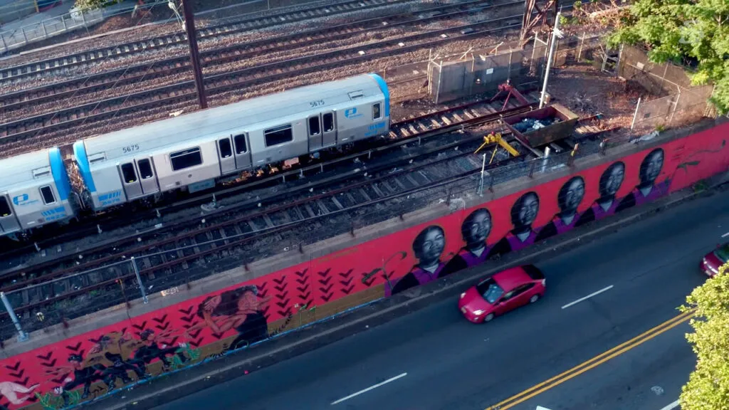 Artist Tatyana Fazlalizadeh discussed her 2016 mural Sakia, Sakia, Sakia, Sakia, and the “radicalizing” tragedy of Sakia Gunn’s murder. The public mural features a repeating series of portrait images of Sakia, and is part of the Gateways to Newark PORTRAITS mural. Check out the video and story we published on that transformative project here.